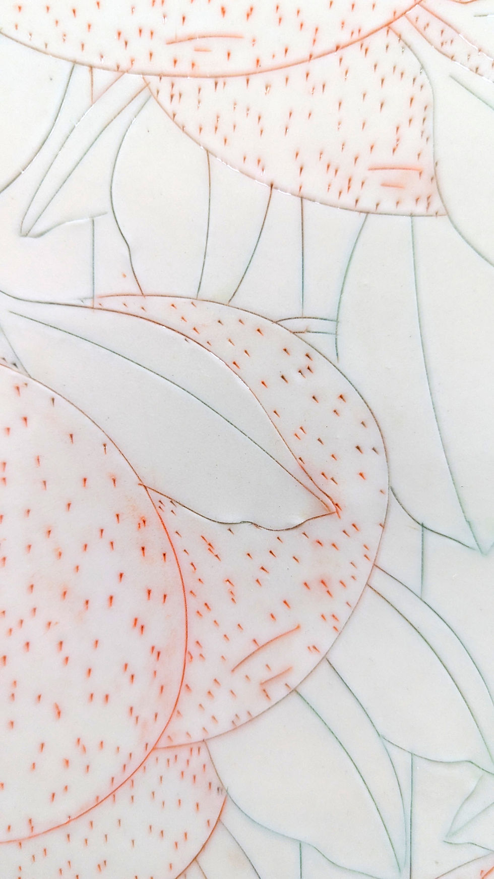 Hand-carved porcelain wall tile mounted in a 9"x9" dark wood shadow box frame.