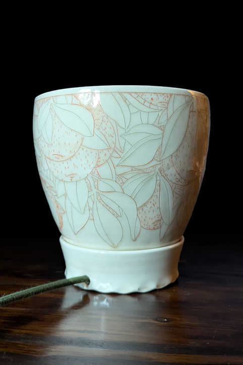 One-of-a-kind pieces featuring hand-carved designs into wheel-thrown translucent porcelain vessels. With an x-acto knife, an original design is carved into the clay before colored stain is applied into the line work. The luminary is kiln-fired to 2300° for durability and translucency.